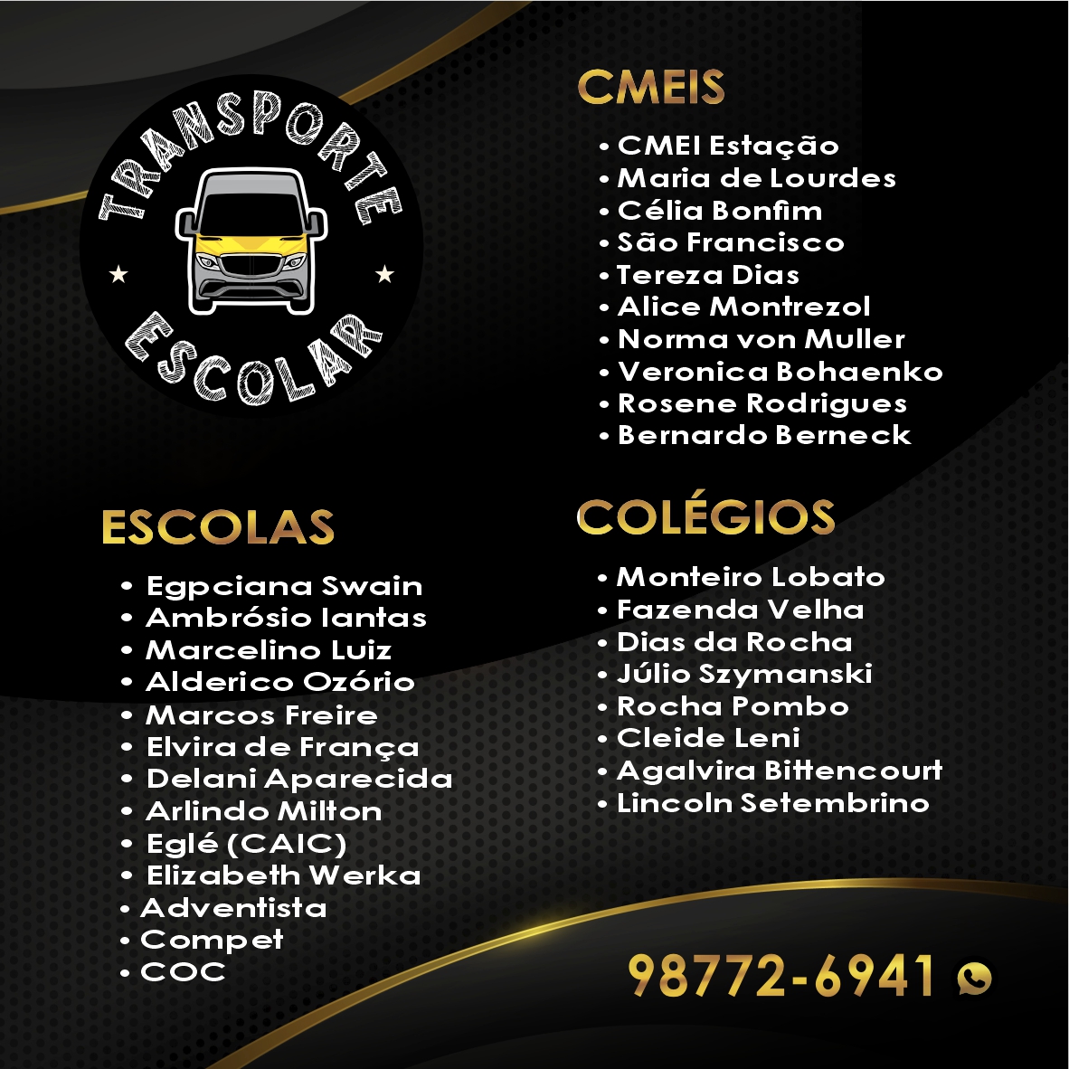 🚐 Transprote Escolar 👶 CMEIs (Creches) 📚Colégios ✏️Escolas🎸 Eventos 🕖Locação 🚐Aluguel de Vans Colégios, Escolas, Pré-escola, Creches, CMEIs, Passeios Escolares, Escolinha de Futebol, Volei, Colônia de Férias, Parques de Diversão. Locação de…