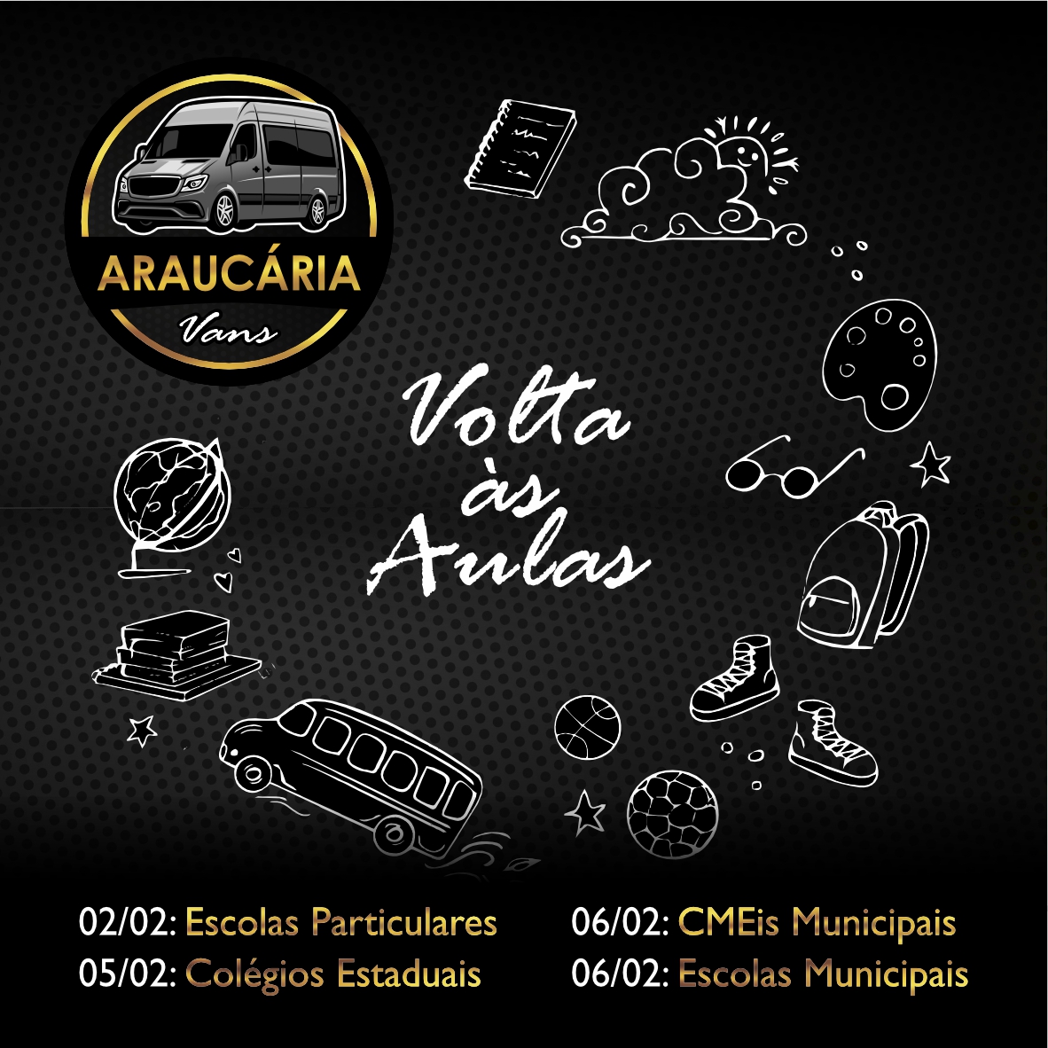 🚐 *INÍCIO DAS AULAS 2026 em Araucária* Dia: 02/02 – *Escolas Particulares **Dia: 05/02 – *Colégios Estaduais*Dia: 06/02 – *CMEis Municipais*Dia: 06/02 – *Escolas Municipais* *Escolas Particulares: consulte diretamente na secretária o…